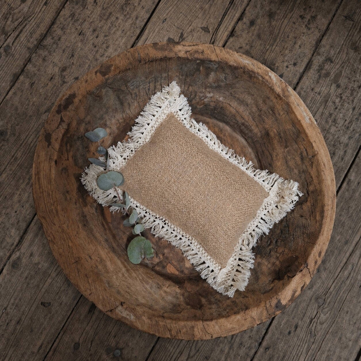 The rustic natural fabric combined with delicate fringe and boho lace details adds warmth, texture, and an organic look to every image. Perfect as a tiny head support or decorative layering piece in baskets, bowls, or on blankets.